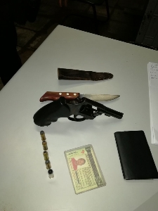 Após a denúncia, uma composição policial iniciou as diligências e seguiu até uma churrascaria situada no Centro de Aratuba. José Luiz Marreiro dos Santos (32) – conhecido por "Zé Pequeno" – estava na companhia de outras pessoas, tendo um deles empreendido fuga ao perceber a chegada dos militares. Uma abordagem foi realizada, o que resultou na apreensão de um revólver calibre 38, com cinco munições. Um segundo individuo, José Aldair Sousa da Silva (23) – sem antecedentes – também foi capturado portando uma faca na cintura. Material que também foi apreendido pela PMCE.