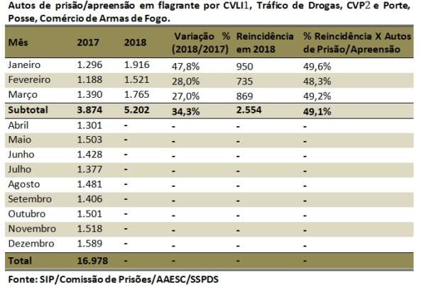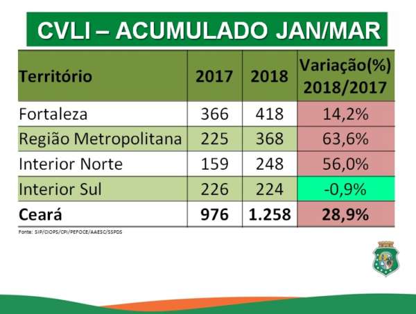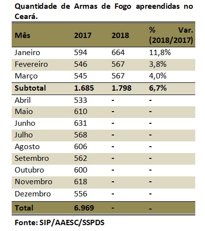 A apreensão de armas de fogo cresceu 4% no Estado em março passado comparado com o terceiro mês de 2017, passando de 545 unidades apreendidas no Ceará para 567. Já o número de prisões e apreensões em flagrante, por CVLI, tráfico de drogas, Crime Violento Contra o Patrimônio (CVP) e porte, posse e comercialização de arma de fogo, saltou 27%, indo de 1.390 para 1.765. O número de latrocínios – roubo seguido de morte – caiu de cinco para três casos, se comparados os meses de março de 2017 e 2018, o que representa uma redução de 40%. No acumulado do ano, a diminuição é de 36,8%, caindo de 19 para 12 casos.
