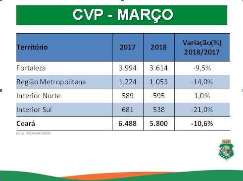 Os esforços empregados pelas Forças de Segurança do Ceará no combate à criminalidade possibilitaram que o índice de Crimes Violentos Letais Intencionais (CVLI), em Fortaleza, apresentasse, em março último, uma redução de 13,6% se comparado com o mesmo mês de 2017. No mês passado aconteceram 133 CVLIs na Capital. Já em março do ano passado, 154. Este e outros dados foram apresentados pelo secretário da Segurança Pública e Defesa Social, André Costa, nesta sexta-feira (06), em reunião do programa “Em Defesa da Vida”, realizada na sede da SSPDS. A diminuição dos CVLIs em Fortaleza é resultado da ocupação policial permanente em dez áreas que mais concentravam homicídios da cidade. Já no Ceará, em março último (414 casos), o número de CVLIs apresentou aumento de 15,6% (358 vítimas).