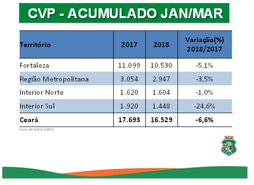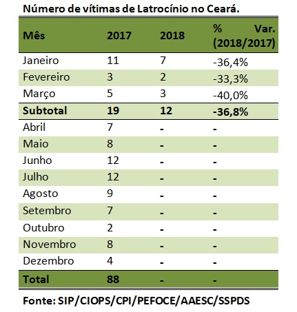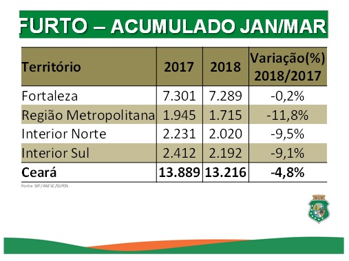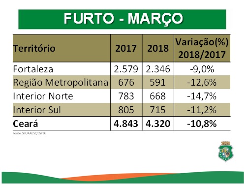 Os registros de Crimes Violentos contra o Patrimônio (CVP) tiveram redução de 9,5% na Capital, diminuindo de 3.994 em março de 2017 para 3.614 em março último. No Estado, a queda foi de 10,6%, passando de 6.488 para 5.800. Os furtos apresentaram diminuição de 9% em Fortaleza, passando de 2.579, em março de 2017, para 2.346, no mês passado. No Ceará, a redução dos furtos foi ainda maior (10,8%), caindo de 4.843 registros para 4.320. Já o número de ocorrências de roubo ou furto a instituição financeira no Ceará caiu 16,7% em março, passando de seis ocorrências para cinco. No acumulado do ano, esse índice apresentou queda de 47,4%, sendo 19 registros no primeiro trimestre de 2017 e dez no mesmo período do deste ano.