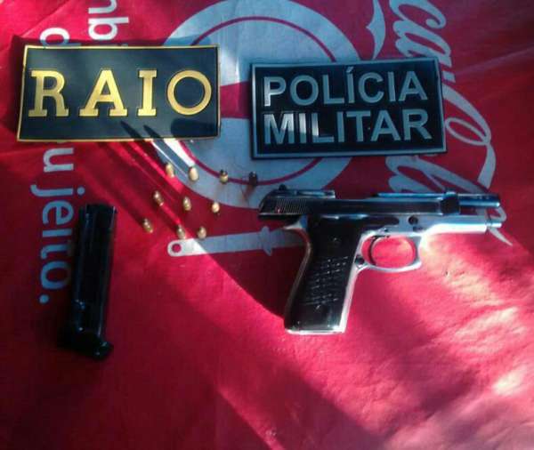 Equipes da Força Tática e do BPRaio realizaram revista na residência do homem. Os policiais encontraram dentro de uma panela, escondida em um dos quartos da casa, uma pistola e 14 munições intactas.