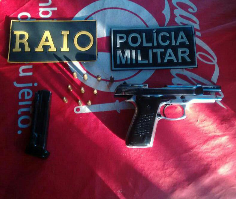 Equipes da Força Tática e do BPRaio realizaram revista na residência do homem. Os policiais encontraram dentro de uma panela, escondida em um dos quartos da casa, uma pistola e 14 munições intactas.