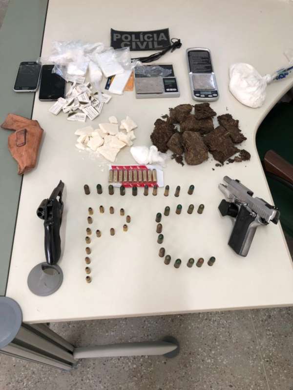 Ao chegarem à residência indicada como ponto de vendas dos entorpecentes, os agentes de segurança perceberam dois indivíduos empreendo fuga. Um deles foi contido e identificado como Jheyme Anjos da Silva (23), com passagem pela polícia por tráfico de drogas. Já o outro indivíduo conseguiu se evadir do local. Os policiais civis realizaram uma vistoria na casa e encontraram um revólver calibre 38, 25 munições de calibre 38, uma pistola, 19 munições da pistola, 400 gramas de maconha, 190 gramas de cocaína, R$ 90,00 em espécie e uma motocicleta de marca Honda/Pop100, cor amarela e placa NGY-6066.