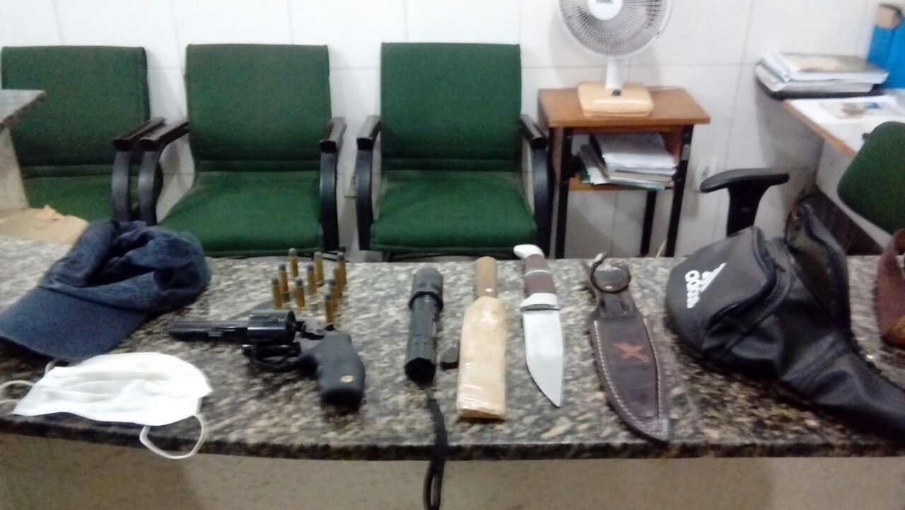 A Polícia Militar do Ceará (PMCE) evitou um duplo homicídio, na madrugada desse domingo (10), no município de Itapiúna, na Área Integrada de Segurança 15 (AIS 15). Um homem vestido de camisa manga longa, capuz, boné, luvas e uma máscara hospitalar foi preso em flagrante após abordagem dos agentes. O suspeito revelou que preparava uma emboscada para dois desafetos que estavam em uma festa próxima do local. Um revólver 38, munições e duas facas foram apreendidas com o suspeito.