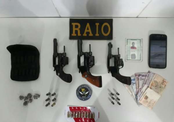 Uma equipe do Raio fazia patrulhamento, no bairro Santa Teresa, quando os policiais militares abordaram o adolescente e um adulto, em atitude suspeita, numa motocicleta. O menor estava na posse de um celular com fotos de armas, momento em que os PMs se dirigiram até a residência dele e lá localizaram dois revólveres de calibre 32 e um .38, além de 22 munições dos mesmos calibres, com seis trouxinhas de maconha.