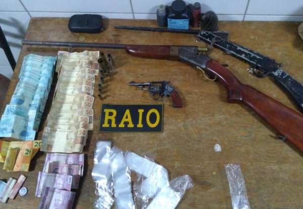 Ao chegar à casa, os PMs realizaram vistoria policial encontrando uma espingarda de calibre 32, uma espingarda de calibre 16, um revólver de calibre 22, com uma munição, e R$ 1.717,75. Foi observado pelos policiais militares a existência de um buraco, onde estariam escondidas as drogas. Segundo informações colhidas pelos PMs, momentos antes, drogas foram retiradas de lá, pelo companheiro da suspeita devido a chegada da Polícia.