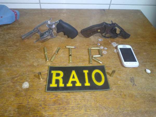 Ao chegarem ao local, os policiais militares avistaram os criminosos em uma motocicleta. Os indivíduos tentaram se evadir do local, mas perderam o controle da moto, vindo a colidir com a viatura. Os homens foram abordados e entregaram aos policiais dois revólveres municiados e um saco com cocaína. Eles foram identificados como Cássio Paiva Marques (20) e Fabrício Makson Rodrigues de Paula (21), ambos sem antecedentes criminais.