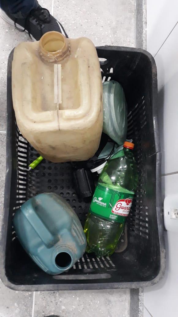Dando continuidade às diligências, os policiais chegaram ao local onde estaria o piloto da motocicleta. O suspeito não foi encontrado no imóvel. Foi realizada vistoria no local, onde foram encontrados dois galões e uma garrafa pet, material utilizado para transportar gasolina. Com base no que foi encontrado, o menor foi levado para a Metropolitana de Maracanaú, onde foi registrado ato infracional análogo pelo crime contra a incolumidade pública.