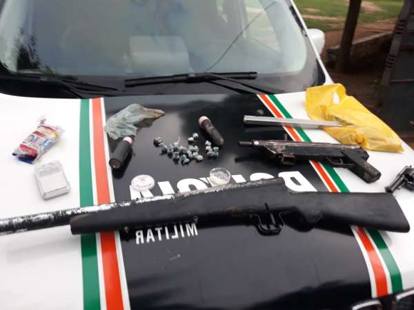 Após receberem as informações sobre a localização de dois suspeitos de integrarem uma organização criminosa, na zona rural do município, as equipes diligenciaram até a região onde visualizaram dois homens com as mesmas características apontadas na denúncia. Na abordagem, nenhum dos indivíduos portava documentos, sendo necessária uma diligência até a casa dos infratores.