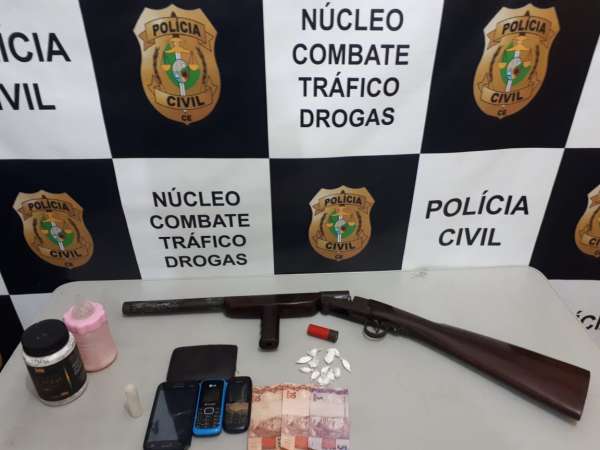 Após o núcleo especializado receber a informação de que uma residência funcionava como ponto de comércio de drogas, os policias civis se deslocaram até o bairro da Betolândia, onde passaram a averiguar o fluxo de pessoas frequentando o imóvel apontado. Chegando ao local, abordaram Renato do Nascimento Ferreira (25), com antecedentes por lesão corporal, e apreenderam uma espingarda calibre.12 municiada. Além disso, os policias localizaram um recipiente transparente e uma mamadeira, ambos com um pó branco semelhante à cocaína, e no muro da casa, ainda tinham 12 trouxinhas de cocaína prontas para venda.