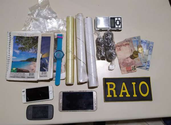 Luis Iran Rodrigues de Lima Filho (25), com passagens por tráfico de drogas, foi capturado pelos raianos. Em seguida, o criminoso informou a existência de entorpecentes em sua casa. Os PMs então iniciaram buscas nos dois imóveis de Luis Iran, onde encontraram 297 gramas de maconha, 21 g de cocaína, uma balança de precisão, três celulares, uma caderneta com anotações, rolos de plásticos e uma quantia em dinheiro no valor de R$ 118.