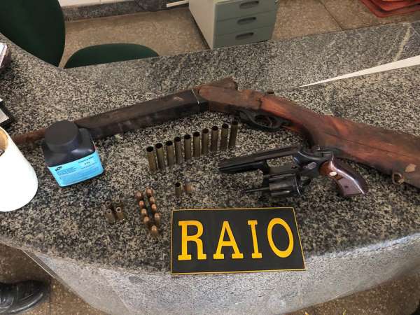 Os raianos entraram no imóvel e lá avistaram dois indivíduos identificados como Antônio Fernandes de Alcântara Júnior (29), com passagem pela Polícia por ameaça; e Gilvan Vieira de Sousa (50), também conhecido como “Duda” e com antecedentes criminais por receptação. Os policiais revistaram a casa e encontraram uma espingarda calibre 28, 12 munições de calibre .40, dez cartuchos deflagrados calibre 28, uma munição calibre 38 intacta e outra deflagrada e dois aparelhos celulares.