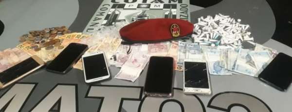 Em um dos quartos, foram encontrados 109 pinos de cocaína, três papelotes de maconha e R$ 220,00 em cédulas e moedas. Questionados sobre o material, o casal informou aos militares que outras pessoas residiam ali e que não sabiam do ilícito. A patrulha foi até o local onde o outro suspeito estava. Durante a busca pessoal, encontraram R$ 170,00 com o adolescente, que confessou ser o dono dos entorpecentes.