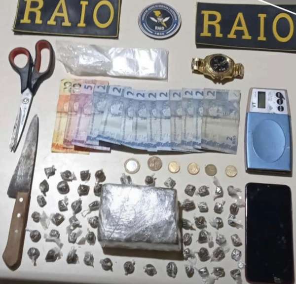 Durante as buscas, os raianos encontraram um tablete de maconha, diversos envelopes plásticos, usados para embalar e comercializar a droga. Em outro cômodo do recinto, foram encontradas trouxinhas de maconha, já prontas para a venda, além de uma balança de precisão e uma pequena quantia de dinheiro em espécie. A mulher, que foi identificada como Bruna Karolayne Santos do Vale (21), assumiu que de fato era a proprietária do entorpecente.