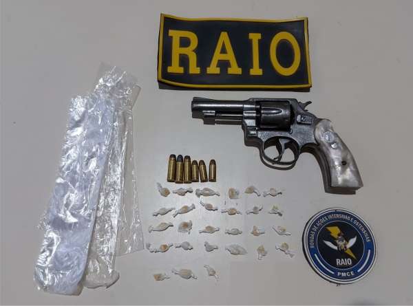 Durante o serviço, a composição recebeu denúncias sobre um indivíduo que estaria traficando drogas e que também estaria portando uma arma de fogo. Com as informações em mãos, duas equipes do CPRaio foram até o local e montaram uma estratégia de abordagem. O suspeito, ao perceber a presença policial, tentou fugir pulando o muro da residência, mas foi capturado pelos PMs.