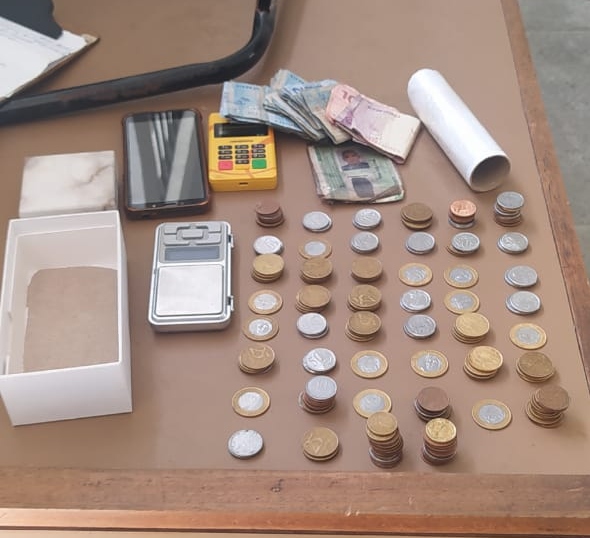 Na manhã de hoje, policiais militares que estavam de serviço no bairro se dirigiram para um endereço onde uma denúncia anônima apontava para um homem que seria responsável por comercializar drogas na região. Chegando ao imóvel, a proprietária da residência permitiu a entrada dos agentes para averiguar a informação. No quarto de Emerson Araújo de Amaral (20), os PMs encontraram uma porção de maconha, uma balança, uma máquina de cartão e uma quantidade de dinheiro dividida entre cédulas e moedas.