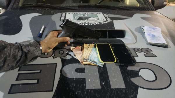 A equipe policial realizava patrulhamento pela região quando foi acionada por um morador, que informou que suspeitos haviam cometido um assalto contra uma loja de açaí no bairro. Em seguida, os indivíduos teriam fugido em um carro vermelho. Durante a ação criminosa, os funcionários do estabelecimento também tiveram seus pertences subtraídos.