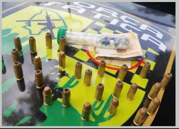 Os militares pediram autorização para fazer buscas, e em uma mesa, logo na entrada da casa, foram encontradas 26 munições calibre .40, um aparelho celular, 12 trouxinhas de cocaína, cinco trouxinhas de crack e R$ 100,00 em espécie. Os militares continuaram as buscas e, apesar de terem encontrado munições, nenhuma arma de fogo foi localizada.