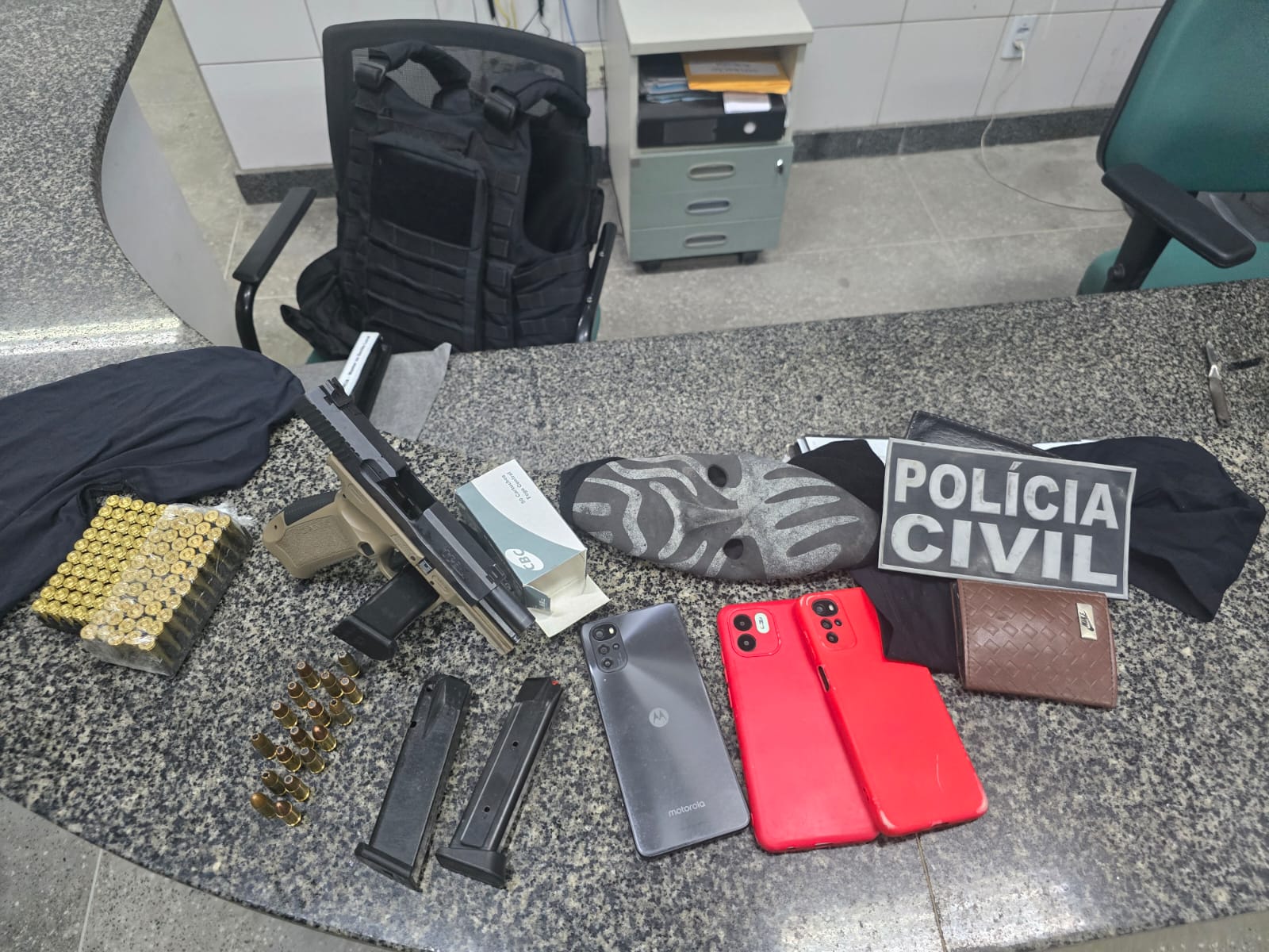 O suspeito, que tentou fugir da ofensiva policial, foi detido em posse de uma pistola de calibre 9x19mm e cerca de 100 munições. Após a captura, ele foi conduzido para a Delegacia Metropolitana de Maracanaú, onde as ordens judiciais foram cumpridas. Além disso, ele foi autuado em flagrante por porte ilegal de arma de fogo. Agora, o suspeito está à disposição da Justiça.