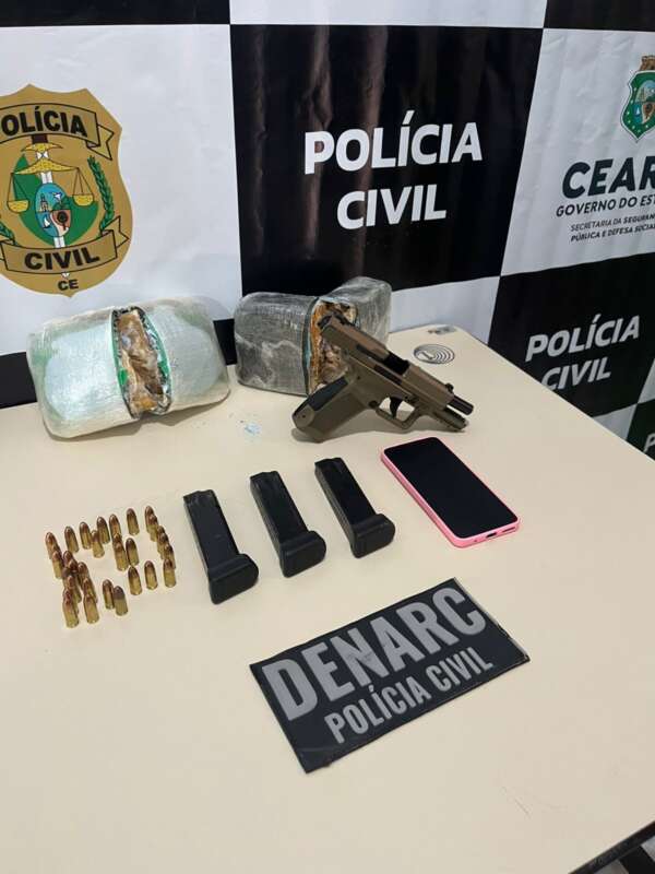 Com a mulher — natural do Ceará — os investigadores apreenderam ainda uma pistola calibre 9mm, carregadores de pistola, munições e artefatos explosivos. Diante do material apreendido, ela recebeu voz de prisão e foi conduzida para uma unidade da PCCE.