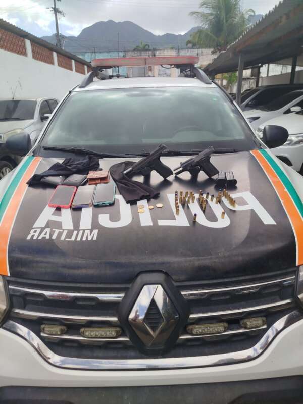 Na primeira ocorrência, registrada nessa quarta-feira (8), a composição da PMCE tomou conhecimento de que homens armados estariam em um imóvel no bairro Amanari. No local, os PMs capturaram três homens, de 22, 25 e 30 anos, com duas pistolas calibre 40, 35 munições e dois carregadores. O trio foi conduzido para a Delegacia de Maranguape, unidade da Polícia Civil do Estado do Ceará (PCCE), onde foi autuado em flagrante por porte ilegal de arma de fogo. O suspeito de 30 anos já responde por homicídio, enquanto o de 25 tem antecedentes por porte ilegal de arma de fogo.