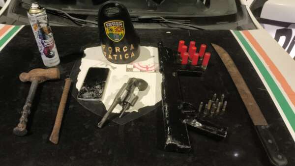 Já na manhã desta quinta-feira (9), os policiais militares visualizaram pessoas em atitude suspeita no bairro Guabiraba. Quando a composição se aproximou do grupo, os suspeitos jogaram sacolas embaixo de um carro estacionado. Os PMs verificaram que, dentro das sacolas, havia uma arma artesanal calibre 12 com dez munições e um revólver calibre 32 com 12 munições. Cinco pessoas foram conduzidas para a Delegacia de Maranguape. Destas, um homem, de 18 anos, foi autuado em flagrante por porte ilegal de arma de fogo e corrupção de menores. Em desfavor de um adolescente, de 15 anos, foi lavrado um ato infracional análogo ao crime de porte ilegal de arma de fogo. Ele já responde a atos infracionais análogos ao crime de receptação. O adulto de 18 anos tem passagens por furto e ameaça.