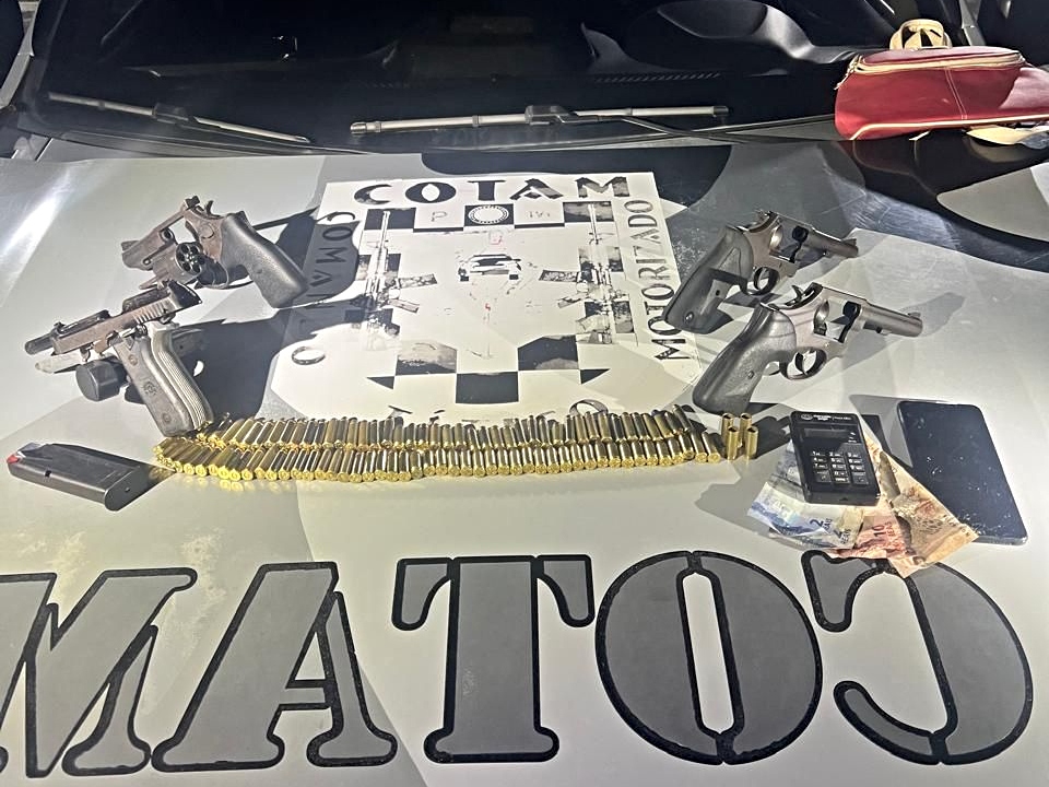 Após buscas em uma residência apontada como sendo o lugar em que os alvos da ação estariam, os militares abordaram quatro homens e, ainda no local, apreenderam quatro armas de fogo – sendo três revólveres de calibre 38 e uma pistola de calibre .40 -, além de 91 munições, um aparelho celular, uma máquina para cartão de crédito e dinheiro.