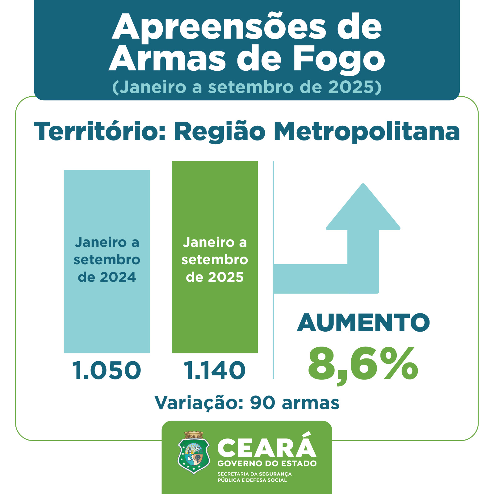 Na Capital e na Região Metropolitana de Fortaleza foram registrados, respectivamente, 6,8% e 8,6% de aumento no quantitativo de armas apreendidas em 2025. Em Fortaleza foram retiradas de circulação 1.256 armas de fogo, nos nove primeiros meses deste ano, e 1.176 no mesmo período do ano passado. Já na Região Metropolitana, foram apreendidas 1.140 armas este ano e 1.050 no ano passado.
