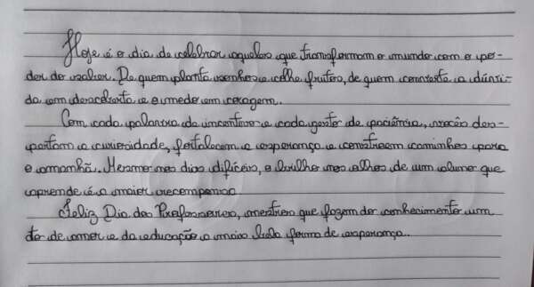 “Todo mundo já teve um professor favorito, não é? Pois eu amo todos os professores! O Dia do Professor é o dia da homenagem dos professores, porque todos esses dias os professores ensinam os alunos. Se não houvesse professores a gente ia crescer sem nenhuma profissão, então os professores são importantes. Mais sabe de uma coisa? Eu amo mais a professora Ana Valéria, porque ela ensina várias coisas e também ela é engraçada…, quer dizer , muito séria, ela ensina religião (ética) e artes. Quando crescer quero ser professora de artes que nem ela!”