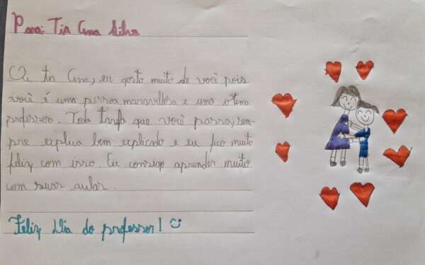 “Oi tia Ana, eu gosto muito de você, pois você é uma pessoa maravilhosa e uma ótima professora. Toda tarefa que você passa, sempre explica bem explicado e eu fico muito feliz com isso. Eu consigo aprender muito com suas aulas. Feliz Dia do Professor!”