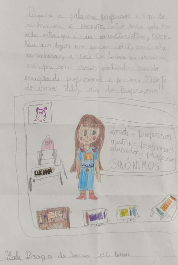 Também do 2° ano do ensino fundamental I, a aluna Cibele Braga de Sousa, fez uma cartinha e um desenho para a professora Luciana Barbosa.