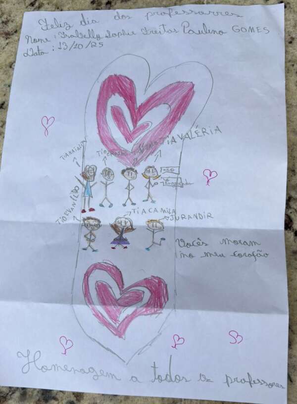 Já no Colégio Militar do Corpo de Bombeiros do Estado do Ceará Escritora Rachel de Queiroz, outras duas alunas fizeram cartinhas para seus professores. A Isabelly Sophie, do 2° ano do ensino fundamental I, fez um desenho representando todos os professores do seu colégio.