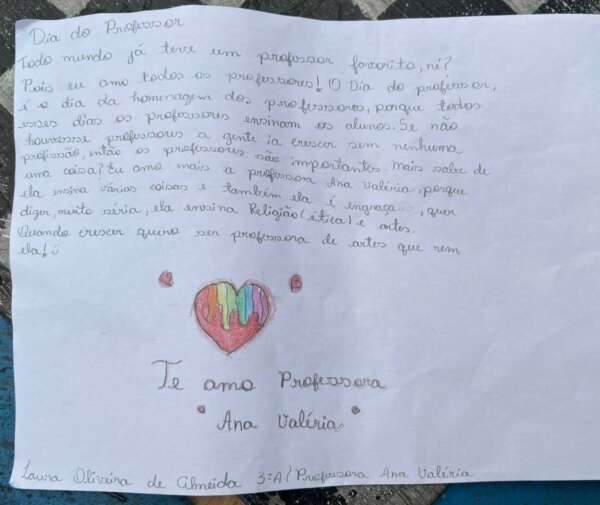 A segunda aluna, Laura Oliveira, do 2° ano do ensino fundamental I, escreveu uma carta para sua professora, Ana Valéria.
