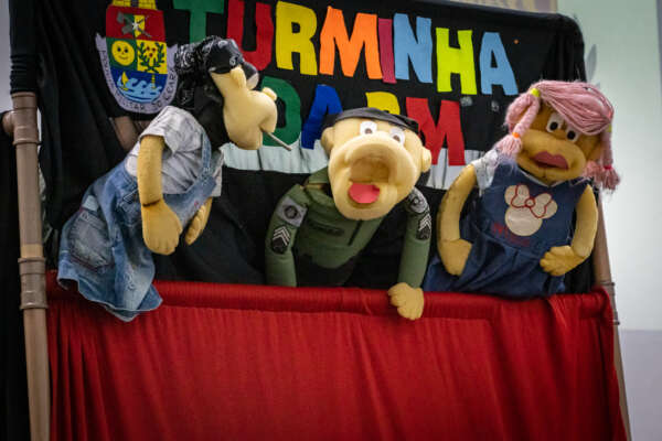 O auditório da Aesp/CE foi palco de muita alegria: na plateia, 23 crianças assistiam, com os olhinhos vidrados, ao espetáculo do projeto de teatro de fantoches Turminha da PM, da PMCE.