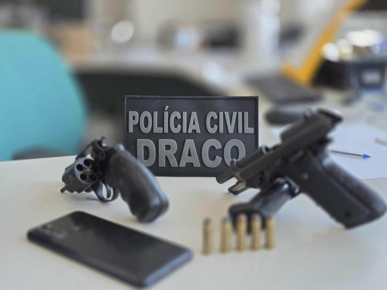 A primeira captura foi em desfavor de um homem, de 37 anos, com passagens por posse ilegal de arma de fogo. Com ele, policiais da Delegacia de Repressão às Ações Criminosas Organizadas (Draco) apreenderam duas armas de fogo, sendo uma pistola calibre 380 com numeração suprimida e um revólver cal. 38, além de um aparelho celular.