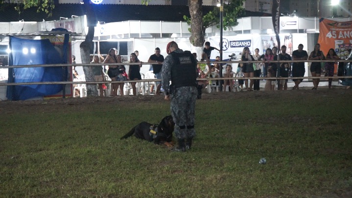 As apresentações com os animais das Forças de Segurança tiveram início na noite dessa quinta-feira (13), quando a Companhia de Policiamento com Cães (CPCães) do Batalhão de Polícia de Choque (BPChoque) da Polícia Militar do Ceará (PMCE) entrou no picadeiro que fica próximo ao estande da Secretaria da Segurança Pública e Defesa Social (SSPDS). Além de interagir com os animais, o público conheceu mais sobre a rotina e o treinamento do canil da PMCE.
