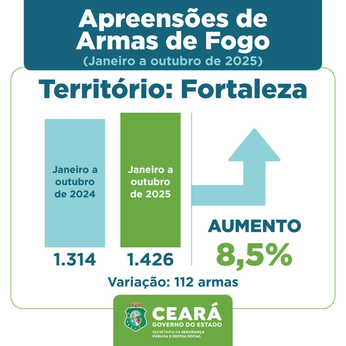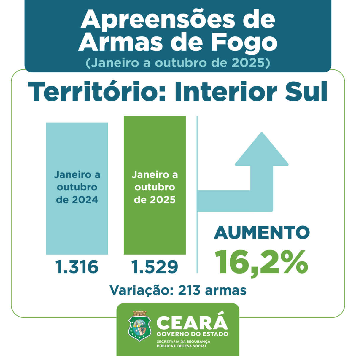 No apurado dos dez meses, todas as regiões do Ceará tiveram aumento no número de apreensões, quando comparadas com esse período de 2024. Em destaque, o Interior Sul com 1.529 armas, com uma variação de 16,2% a mais que o mesmo período de 2024, que contabilizou 1.316 apreensões. Fortaleza também teve aumento de 8,5%, sendo apreendidas 1.426 armas de fogo, 112 a mais que no mesmo período avaliado no ano passado, com 1.314 armas. Na Região Metropolitana foram contabilizadas 1.301 armas apreendidas este ano, um aumento de 12,7% quando comparado aos dez meses do ano passado, quando registrou 1.154 ocorrências de apreensão; e no Interior Norte o aumento foi 11,4% com 1.789 armas este ano e 1.606 no ano passado.