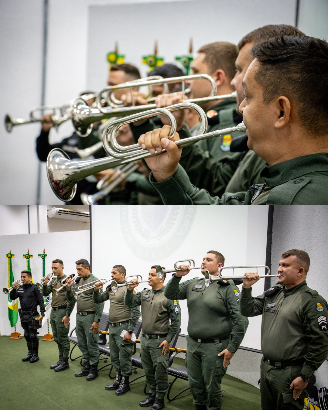 Também foi concluído o Curso de Formação de Corneteiros, ofertado presencialmente pela Aesp/CE, com 80 horas/aula. Ao todo, 12 agentes finalizaram a capacitação, sendo 11 da Polícia Militar do Ceará (PMCE) e 1 do Corpo de Bombeiros Militar do Ceará (CBMCE).