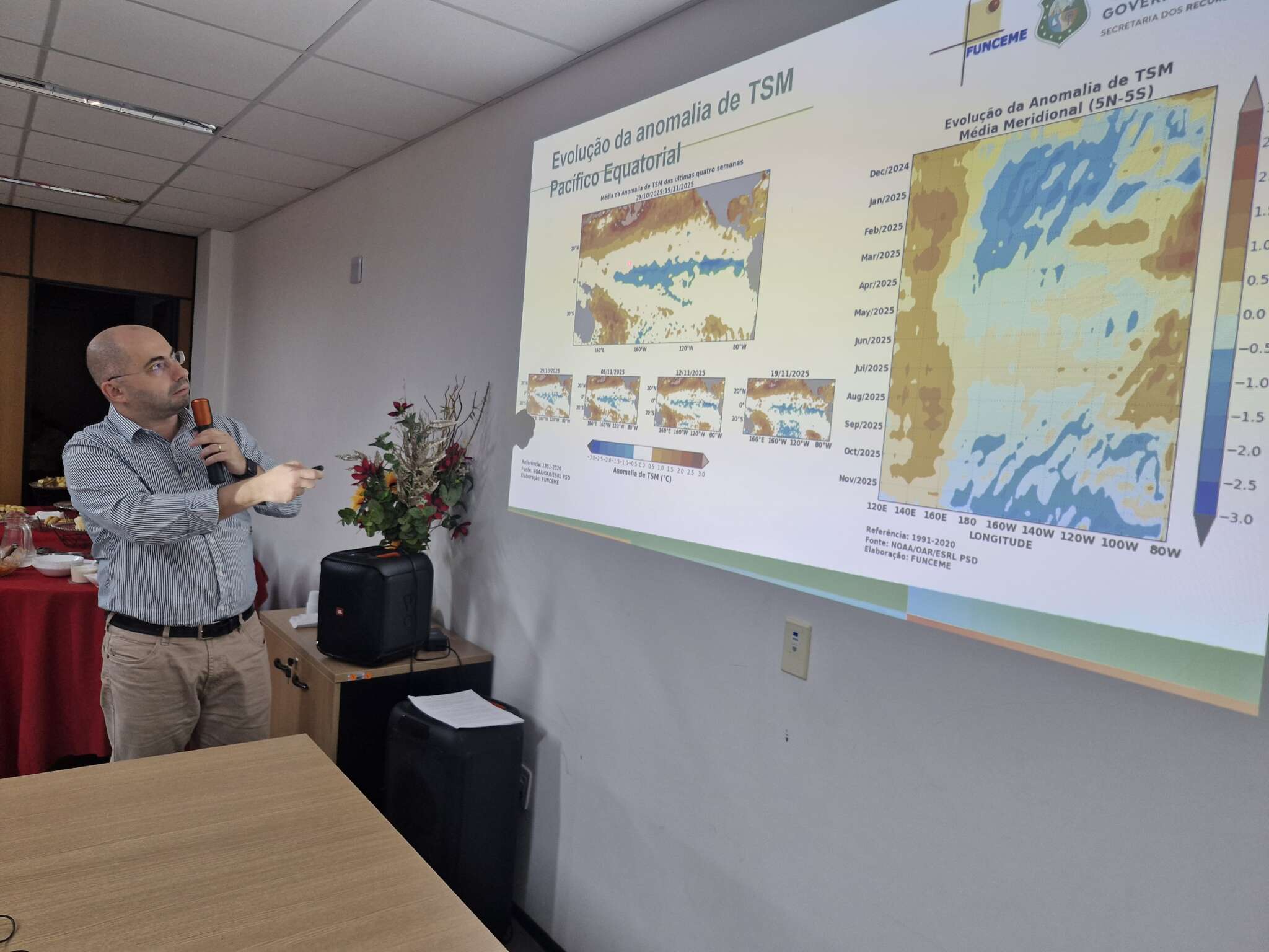 Também foram apresentadas pela Fundação Cearense de Meteorologia e Recursos Hídricos (Funceme), por meio de Júnior Vasconcelos, análises preliminares sobre o cenário climático e medidas voltadas à quadra chuvosa de 2026, que irão subsidiar o planejamento estadual e orientar as ações dos órgãos envolvidos.