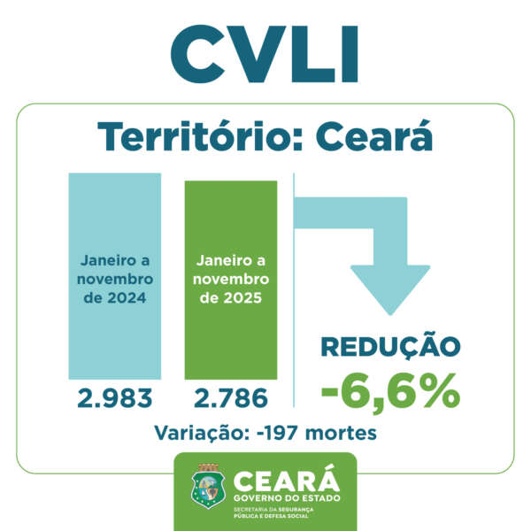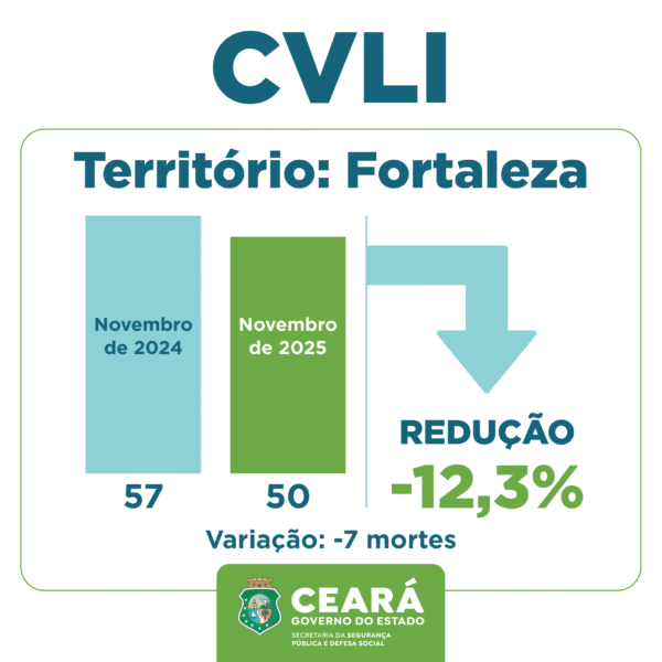 Considerando apenas o mês de novembro de 2025, a redução foi de 2,6%, no Ceará. Foram 263 CVLIs registrados no estado, frente a 270 casos no mesmo mês do ano passado. Na Capital, a redução das mortes violentas atingiu 12,3% em novembro de 2025. Ao todo, foram 50 ocorrências neste ano, contra 57 no mesmo período de 2024. Os dados são da Superintendência de Pesquisa e Estratégia de Segurança Pública (Supesp), órgão vinculado à Secretaria da Segurança Pública e Defesa Social (SSPDS).