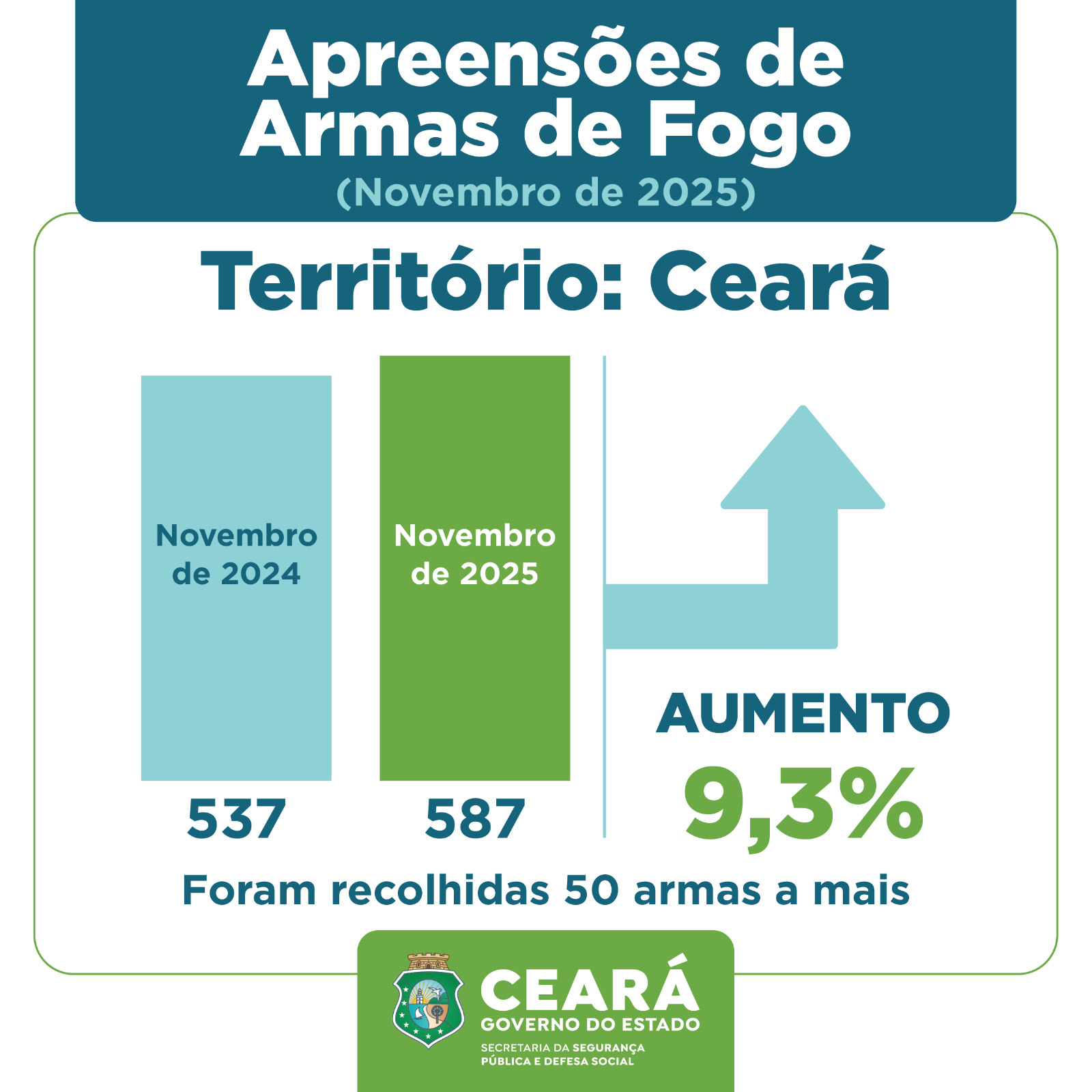Em combate à criminalidade, as forças vinculadas à Secretaria da Segurança Pública e Defesa Social do Ceará (SSPDS-CE) apreenderam 6.632 armas de fogo nos primeiros 11 meses de 2025. O número representa um aumento de 11,9% em relação ao mesmo período de 2024, quando foram recolhidas 5.927 armas. Em média, 20 armas de fogo foram retiradas de circulação por dia em 2025. Foram 705 armas apreendidas a mais no período. Somente em novembro, 587 armas foram apreendidas no estado – alta de 9,3% em comparação ao mesmo mês de 2024, quando o total foi de 537. Os dados foram extraídos e compilados pela Superintendência de Pesquisa e Estratégia de Segurança Pública (Supesp).