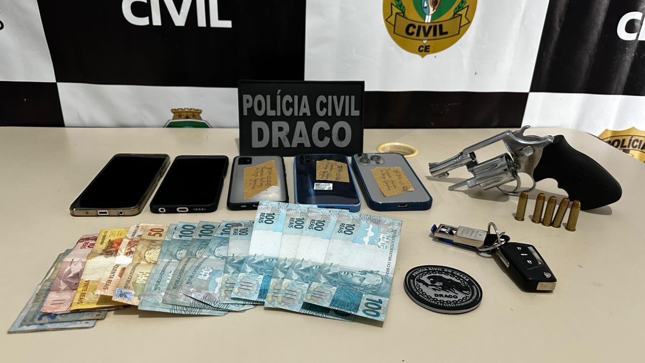 As investigações conduzidas pela Draco Sul indicam que o trio estaria envolvido na distribuição de armas e em outros crimes na região do Cariri. Durante a ofensiva, foram apreendidos um revólver calibre 38 e cinco munições, além de cinco celulares, um carro e uma quantia em dinheiro. Os três suspeitos foram autuados por posse ilegal de arma de fogo. Contra o homem de 31 anos, também foi cumprido o mandado de prisão preventiva por integrar organização criminosa.
