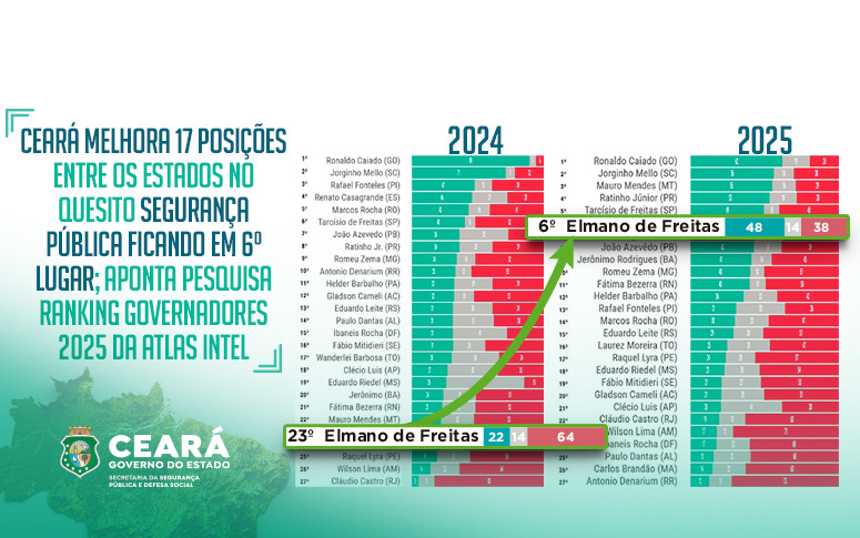 Ceará melhora 17 posições entre os estados no quesito segurança pública e alcança 6º lugar nacional, aponta Ranking Governadores 2025 da Atlas Intel