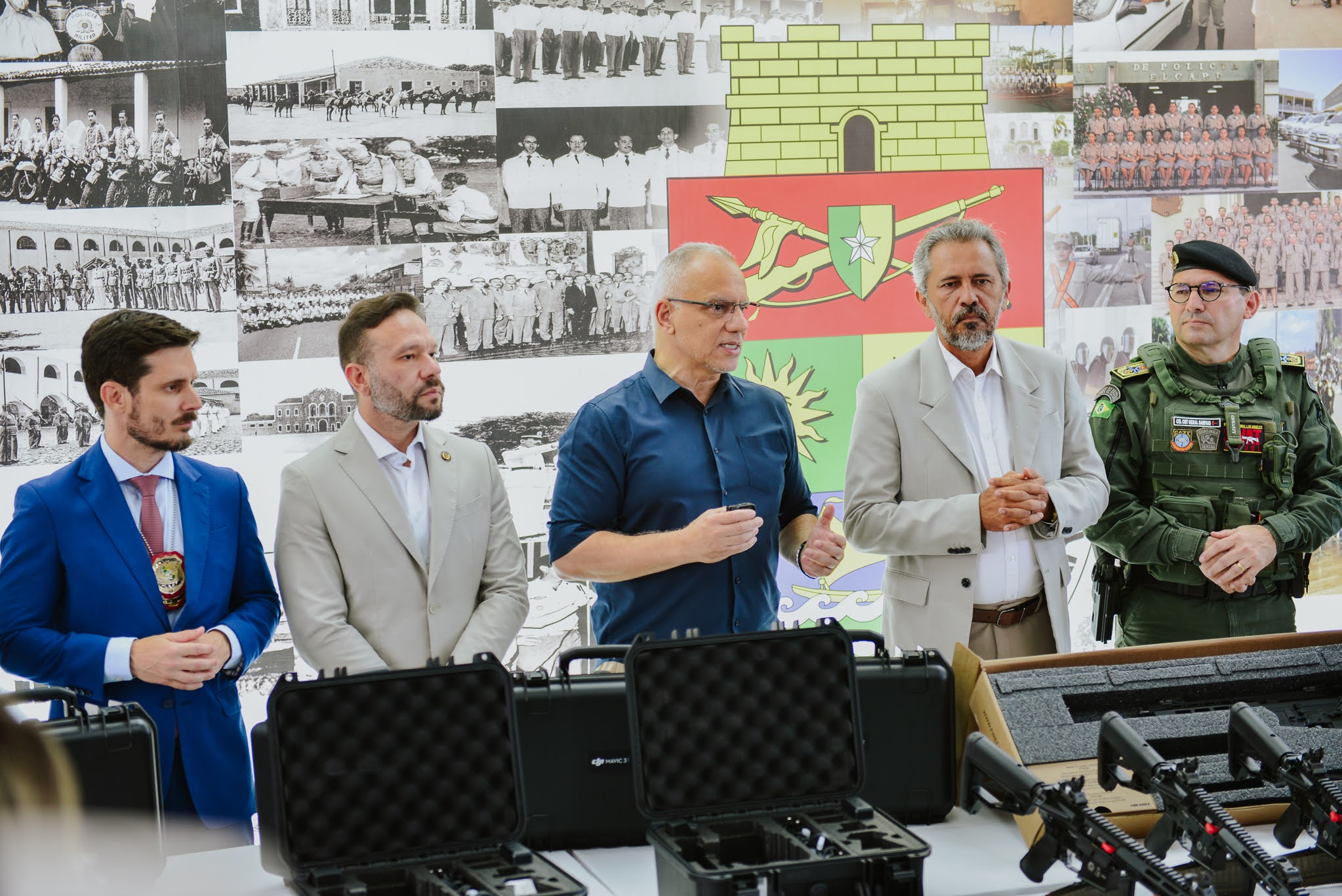 O Governo do Ceará realizou, nesta terça-feira (30), a entrega de 82 fuzis e 15 drones à Polícia Militar do Estado (PMCE). A solenidade ocorreu no Comando-Geral da corporação, no Complexo Integrado de Segurança Pública (Cisp), em Fortaleza, e contou com a presença do governador Elmano de Freitas; do secretário da Segurança Pública e Defesa Social, Roberto Sá; e do coronel comandante-geral da PMCE, Sinval Sampaio, entre outras autoridades.