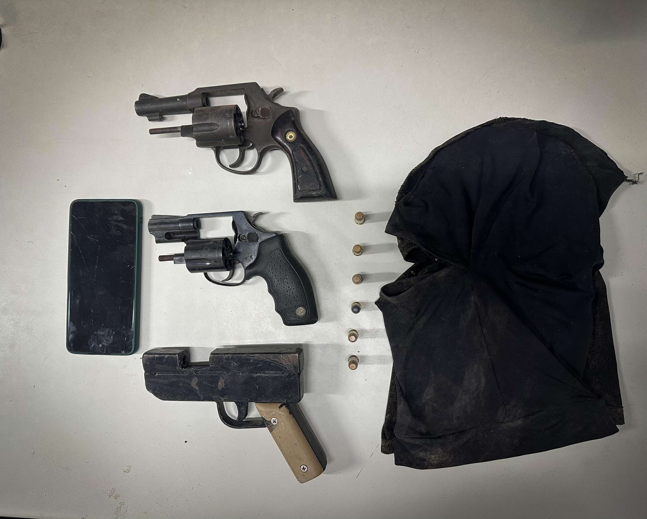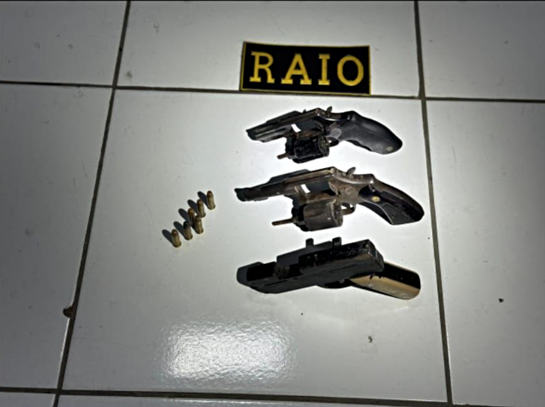 De imediato, os militares foram ao local indicado e localizaram quatro suspeitos – sendo três homens, ambos de 24 anos de idade, e um quarto homem, de 22 anos, que já possui antecedentes criminais por lesão corporal dolosa, ameaça e crimes de violência doméstica e familiar contra a mulher. O grupo estava na posse de dois revólveres calibre 38, uma arma artesanal calibre 38 e seis munições de mesmo calibre, além de dois aparelhos celulares, duas balaclavas e duas mochilas.