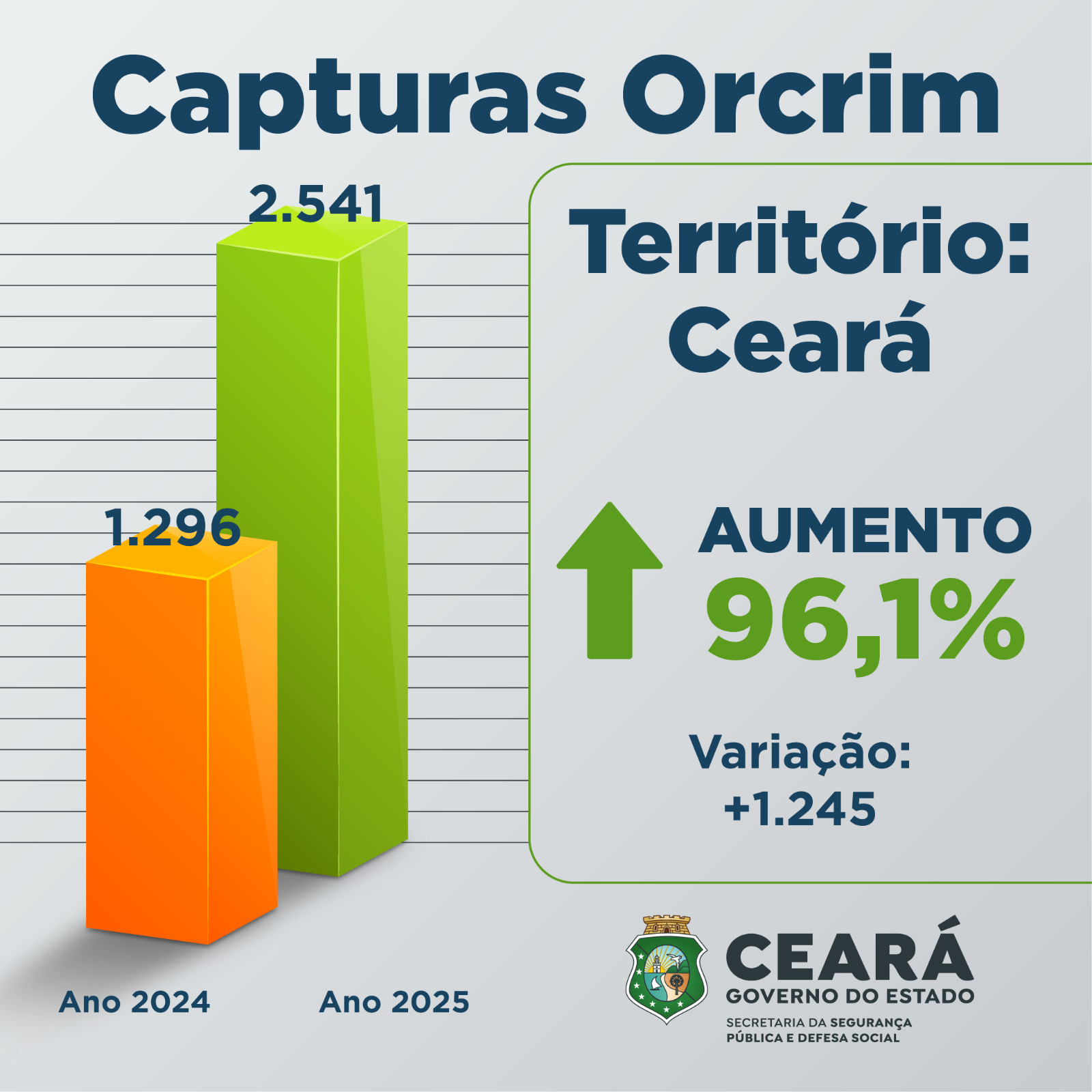 O ano de 2025 termina com saldo positivo em número de prisões e apreensões em todo o estado do Ceará. O trabalho ininterrupto das Forças de Segurança, unindo ostensividade, investigação e inteligência, resultou no total de 35.458 capturas em flagrante ou por cumprimento de mandado, entre janeiro a dezembro de 2025, em todo o estado por crimes diversos, perfazendo cerca de 100 prisões por dia. Dentre os alvos, 2.541 prisões e apreensões foram por envolvimento com grupos criminosos (Orcrim), representando um aumento de 96,1% em relação ao mesmo período do ano passado, quando houve 1.296 capturas. Já em relação a capturas por homicídio, foram presas 2.883 pessoas, um aumento de 32,5% em relação ao ano de 2024, quando foram contabilizadas 2.176 capturas. Os dados foram extraídos pela Superintendência de Pesquisa e Estratégia de Segurança Pública (Supesp), vinculada à Secretaria da Segurança Pública e Defesa Social (SSPDS).