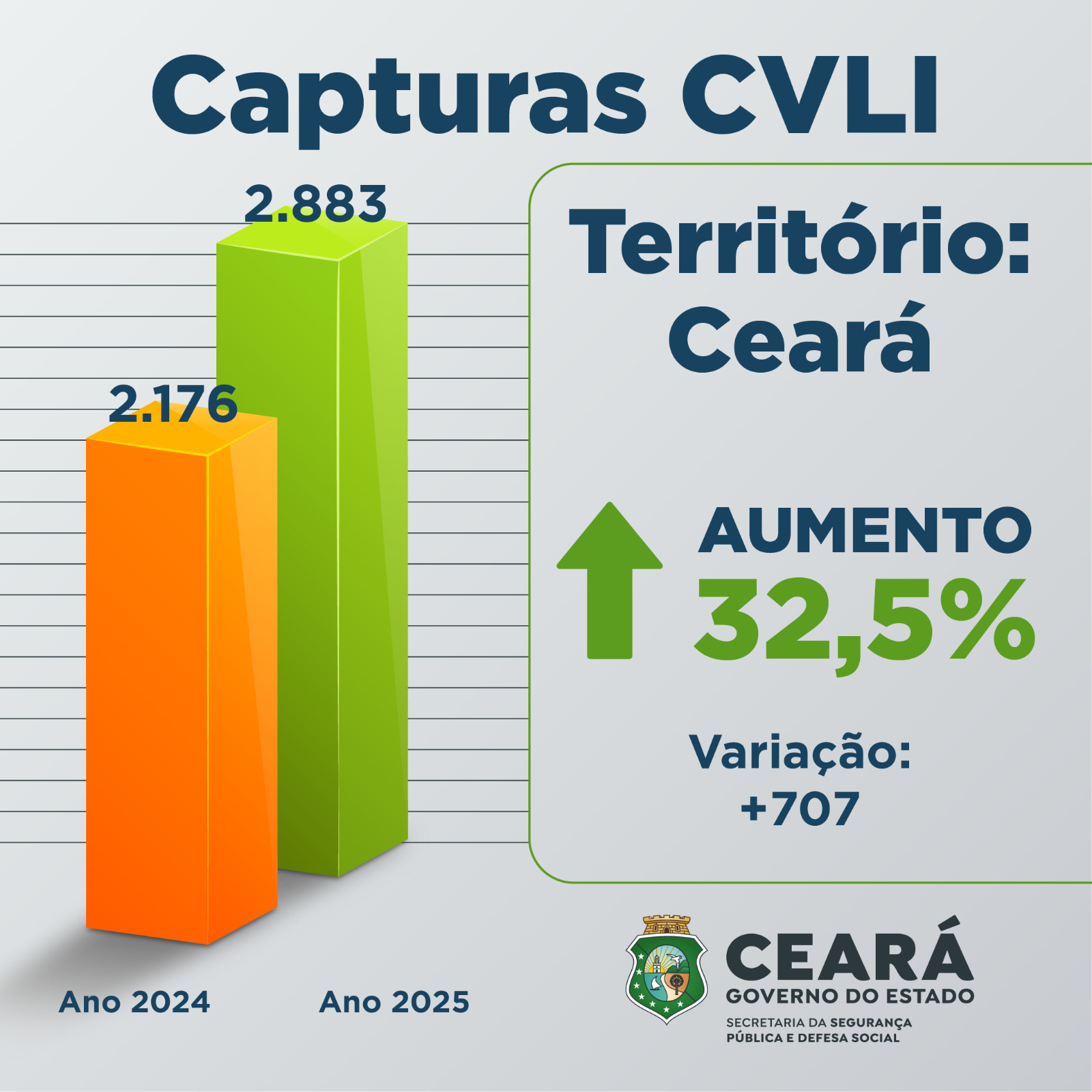 De janeiro a dezembro de 2025, houve aumento de 32,5% nas prisões e apreensões por CVLIs no Ceará, perfazendo um total de 2.883 prisões ou apreensões. O crescimento das capturas aconteceu em todas as regiões do estado. Em Fortaleza, o incremento foi de 23,7%, com 752 capturas em 2025, contra 608 registros nos doze meses de 2024. Na Região Metropolitana, o aumento foi de 40,8%, com 849 casos em 2025, contra 603 prisões e apreensões de janeiro a dezembro de 2024. No Interior Sul, o aumento foi de 46,5%, com 696 capturas em 2025, contra 475 registros em 2024. Já no Interior Norte, o aumento nas capturas por CVLI foi de 16,8%, com 570 registros em 2025, contra 488 capturas em flagrante e por mandado, entre janeiro e dezembro de 2024.