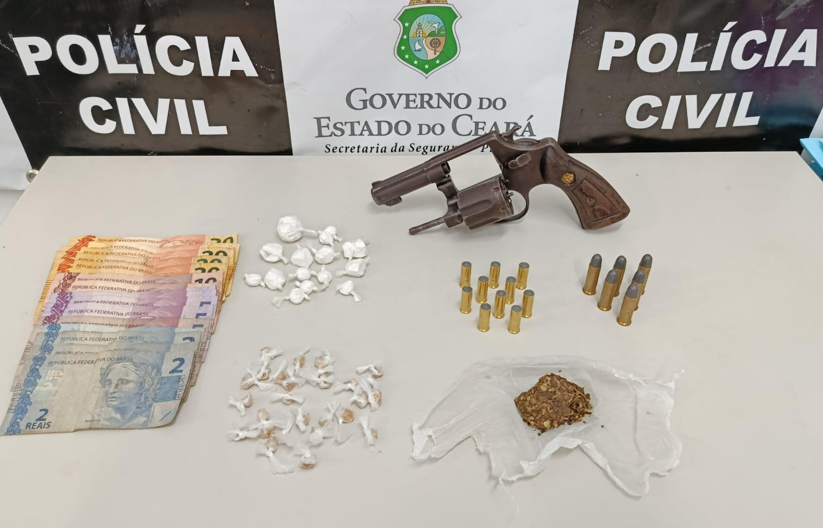 Um homem, de 29 anos, foi preso em flagrante por tráfico de drogas e posse de arma, também em Juazeiro do Norte. Com base em uma denúncia anônima, os investigadores da Polícia Civil tiveram conhecimento da prática de venda de drogas em um imóvel. Dando continuidade a verificação de procedência dos fatos, os agentes policiais moveram-se ao local e encontraram, junto ao suspeito, porções de crack, cocaína, maconha, além de dinheiro, uma arma de fogo e munições. O homem responde por outros três crimes: roubo, furto e homicídio.