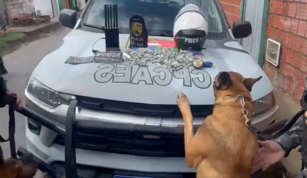 Durante a abordagem, foram encontradas duas trouxinhas de entorpecente no bolso do suspeito. Diante da situação, foi solicitado apoio do Batalhão de Polícia de Choque (BPChoque), com o emprego de cães farejadores, além de outras composições da PMCE. Com o auxílio dos animais, o restante do material ilícito foi localizado no terreno, totalizando a apreensão de 500 trouxinhas de maconha, 50 porções da mesma substância, uma pedra de cocaína, uma balança de precisão, um bloqueador de sinal com dez antenas e diversos sacos plásticos utilizados para o acondicionamento de drogas.