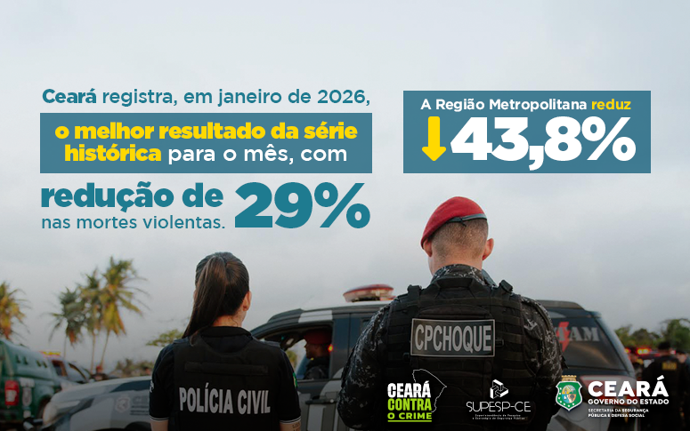 Dando continuidade ao trabalho permanente das Forças de Segurança do Ceará no combate à criminalidade, o ano de 2026 inicia com resultados positivos na redução dos Crimes Violentos Letais e Intencionais (CVLIs). O mês de janeiro encerrou com diminuições de 29% no número de mortes violentas no Ceará, 36,4% nos CVLIs em Fortaleza e 43,8% na Região Metropolitana. Os percentuais indicam que janeiro de 2026 apresentou a maior redução da série histórica de CVLIs, considerando exclusivamente os meses de janeiro, tanto no estado quanto na capital. Além disso, janeiro de 2026 representa a maior redução de mortes violentas dos últimos 75 meses no Ceará (desde outubro de 2019). Os dados foram compilados pela Superintendência de Pesquisa e Estratégia de Segurança Pública (Supesp), órgão vinculado à Secretaria da Segurança Pública e Defesa Social (SSPDS).